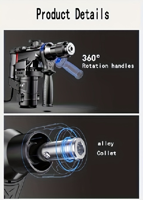 A multi-functional tool that combines hammer drill and chisel to provide better comfort and control during operation. It is mainly used for drilling and punching holes in materials such as wood, metal and concrete. It has variable speed settings, which can be adjusted as needed. Speed and equipped with a drill/bit screwdriver conversion device for easy switching between different tasks